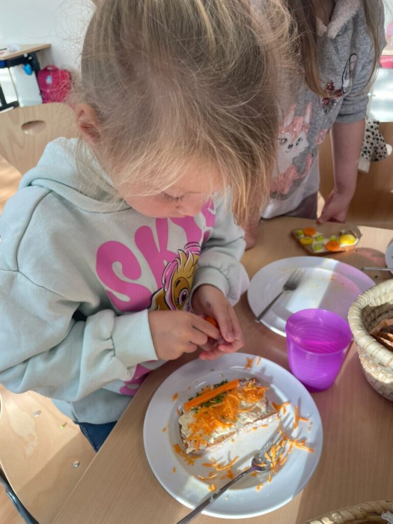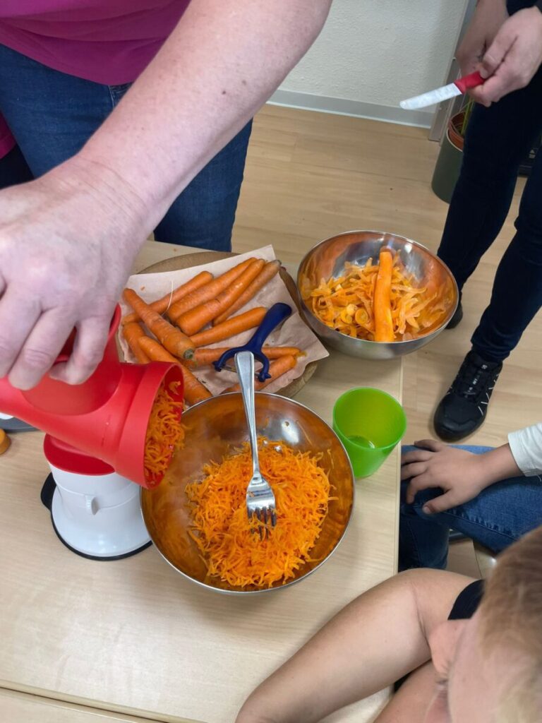 Mit viel Freude bereiteten die Kinder einen köstlichen Karottenaufstrich zu, gestalteten bunte Gemüsebrötchen und ließen sich zum Abschluss einen saftigen Karottenkuchen schmecken.