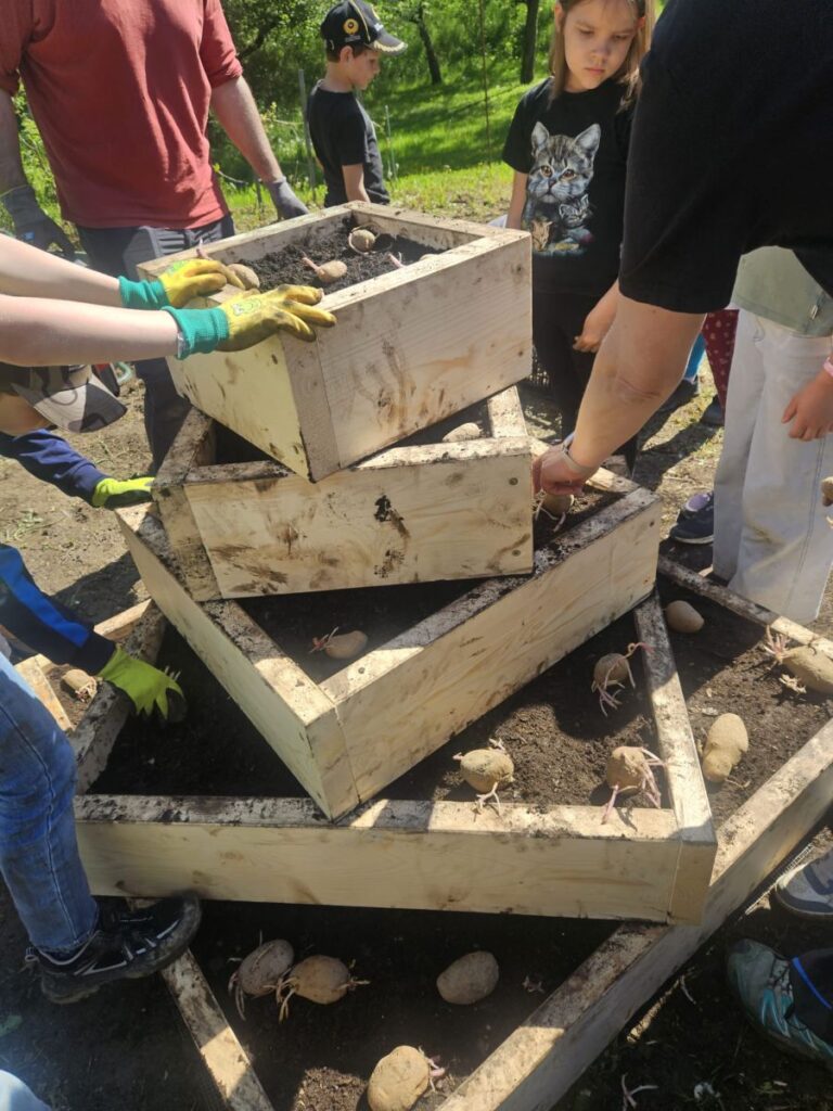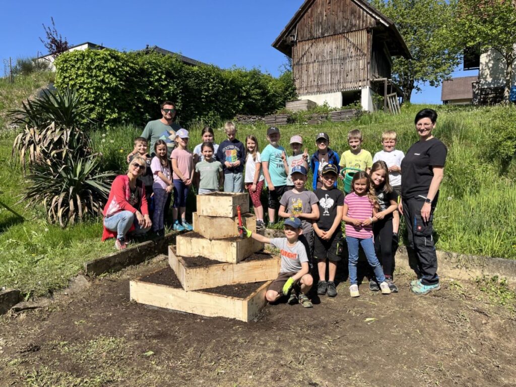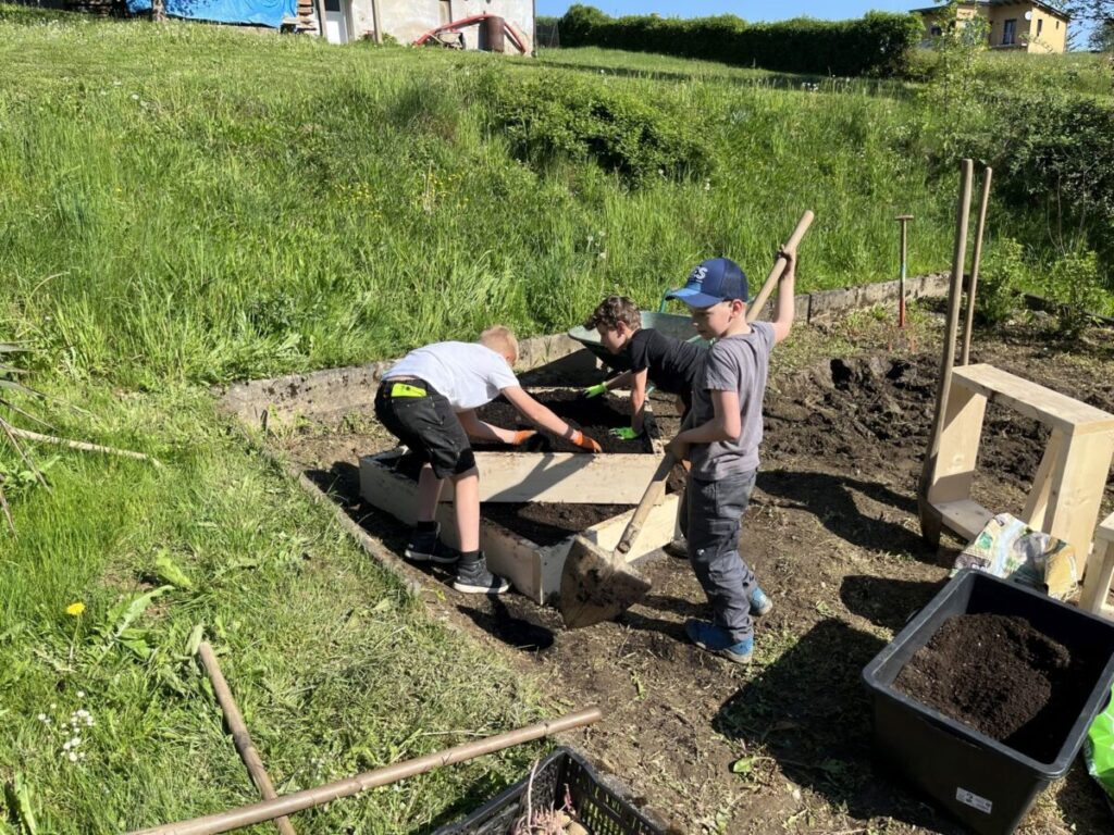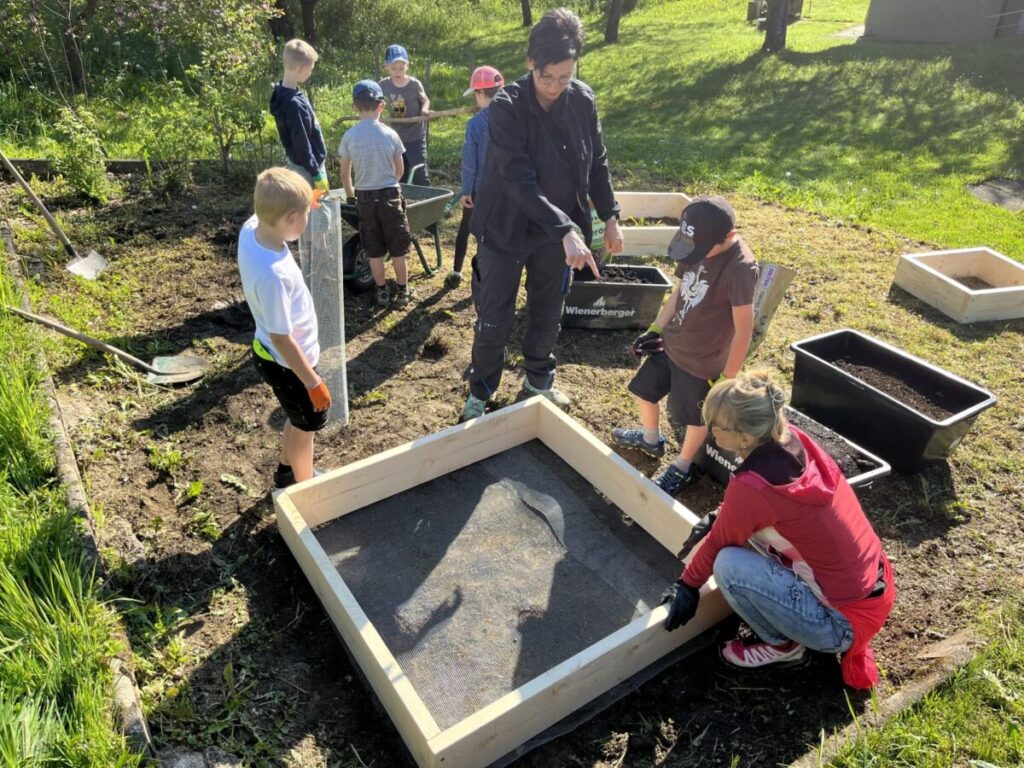 Gebaut wurde sie schließlich Ende April – natürlich von den Kindern und unterstützenden Eltern. Alle packten ordentlich mit an. Entweder beim Schrauben, Graben oder Sieben der Erde oder beim Richten der gesunden Jause unter freiem Himmel. Der Höhepunkt war am Ende des Vormittages das Einsetzen der Kartoffeln. Und ab dann hieß es „Warten“…