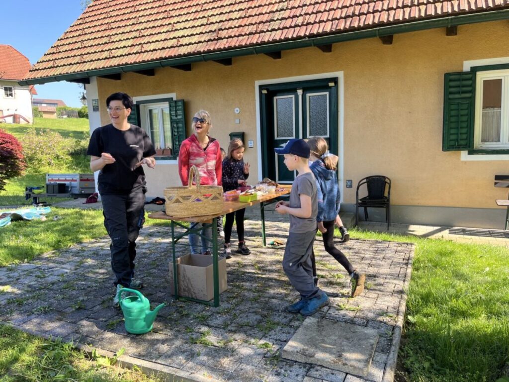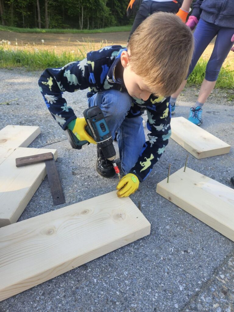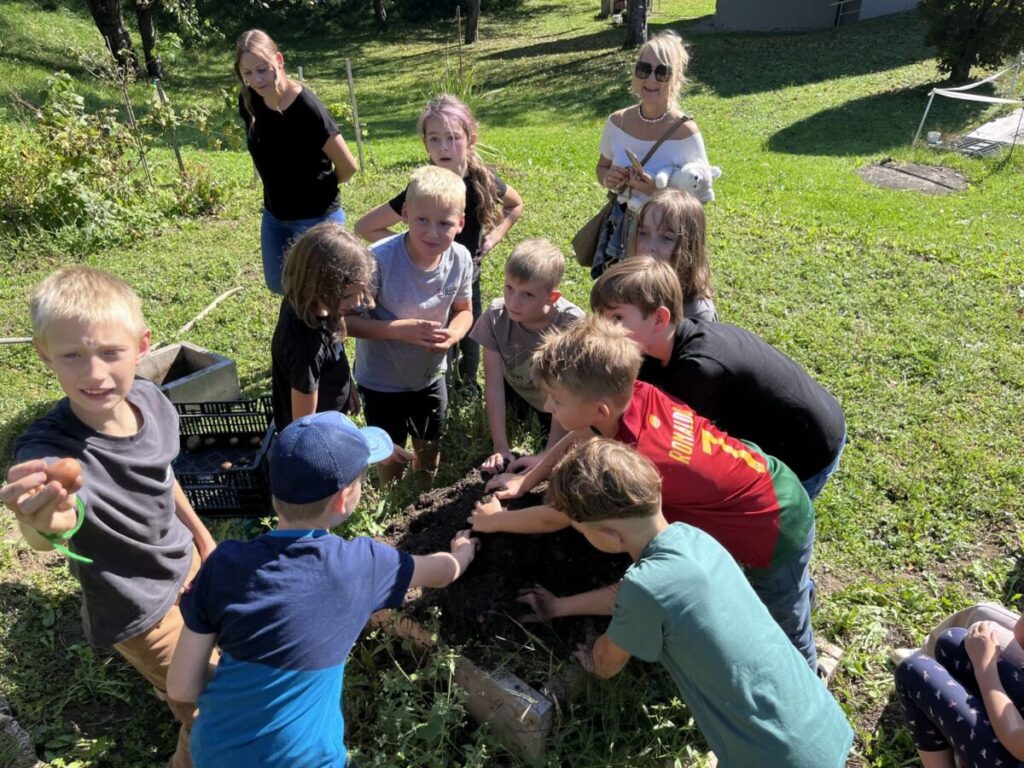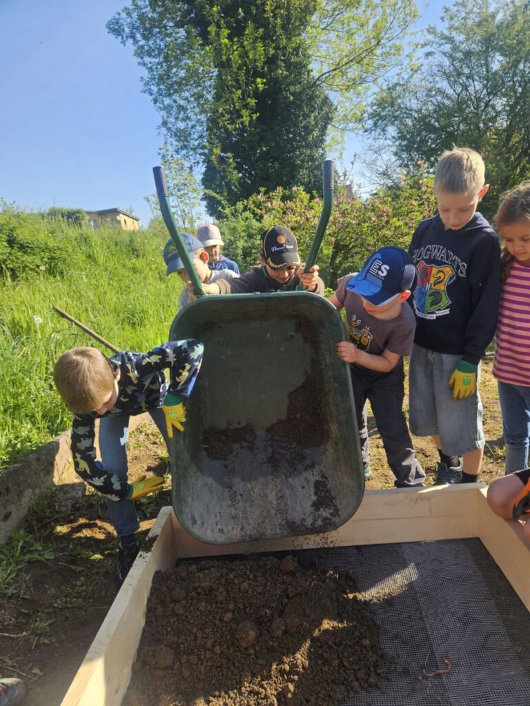 Gebaut wurde sie schließlich Ende April – natürlich von den Kindern und unterstützenden Eltern. Alle packten ordentlich mit an. Entweder beim Schrauben, Graben oder Sieben der Erde oder beim Richten der gesunden Jause unter freiem Himmel. Der Höhepunkt war am Ende des Vormittages das Einsetzen der Kartoffeln. Und ab dann hieß es „Warten“…