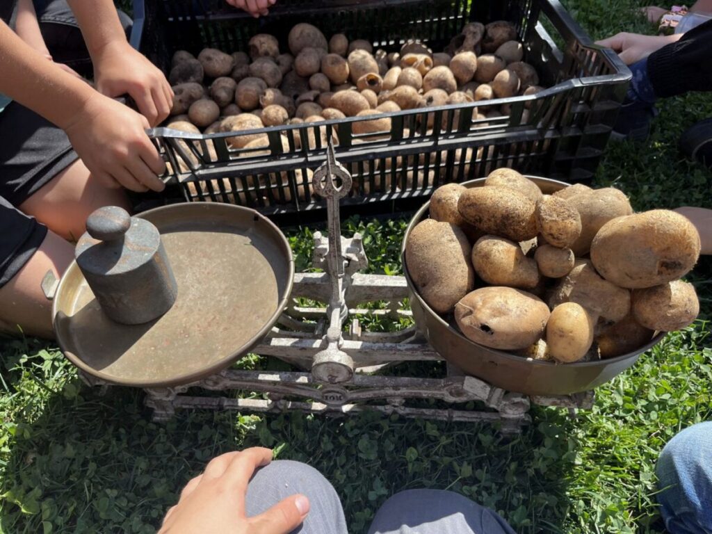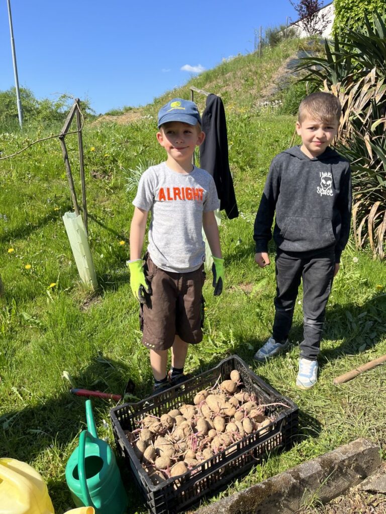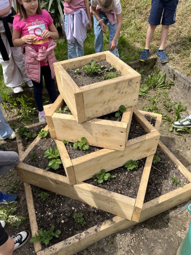 Im Frühling 2024 wurden schon die ersten Weichen zur Umsetzung dieses großen Projektes gesetzt. Das passende Holz, gute Erde und Humus, Werkzeug und ein passender Platz mussten organisiert werden. Und natürlich die Saatkartoffeln. Und dank der großartigen Unterstützung der Eltern war das Projekt „Wir bauen eine Kartoffelpyramide“ schnell auf Schiene.