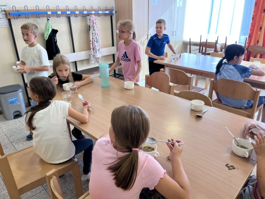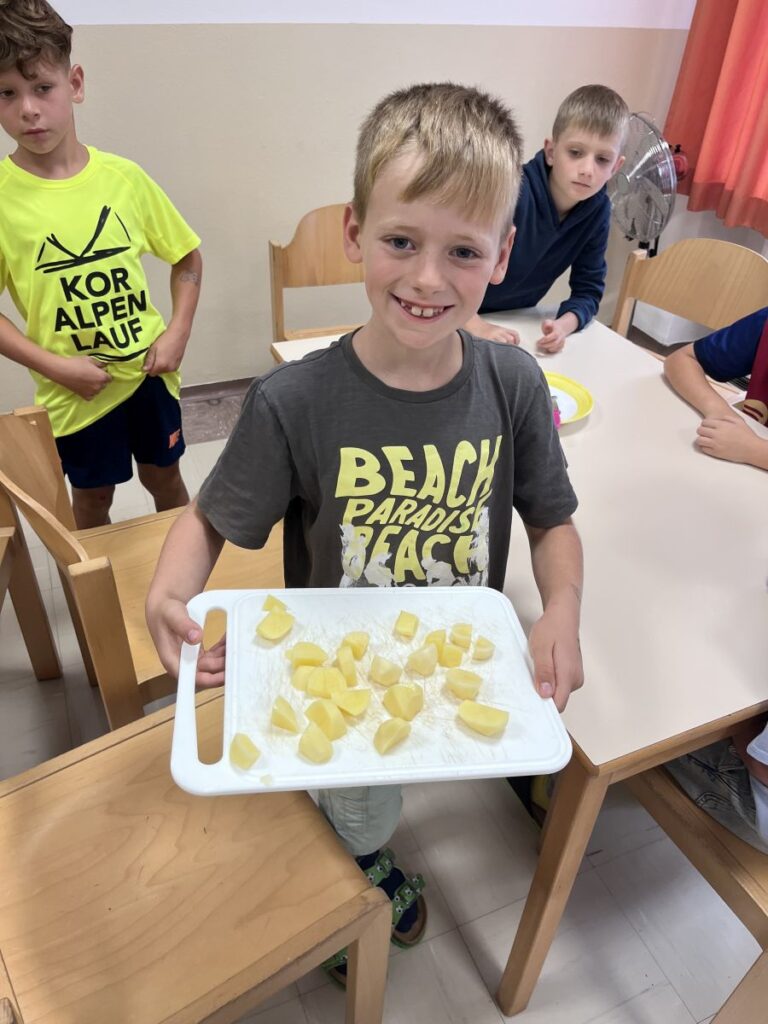 Was tun mit so vielen Kartoffeln? Natürlich verkochen! Und das gleich auf 3 verschiedene Arten – Potato Wedges, Schwammerlsuppe mit Kartoffeln (mit den Pilzen vom Wandertag) und dann noch einmal Kürbiscremesuppe. Schließlich waren alle verkocht und gegessen.